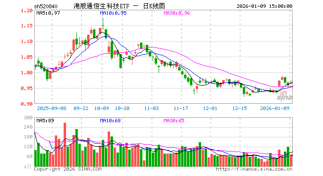 1月9日,港股通恒生科技ETF(520840)涨0.94%,成交额7045.38万元。当日份额增加400.00万份,最新份额为11.98亿份,近20个交易日份额增加5150.00万份。最新资产净值计算值为11.62亿元。