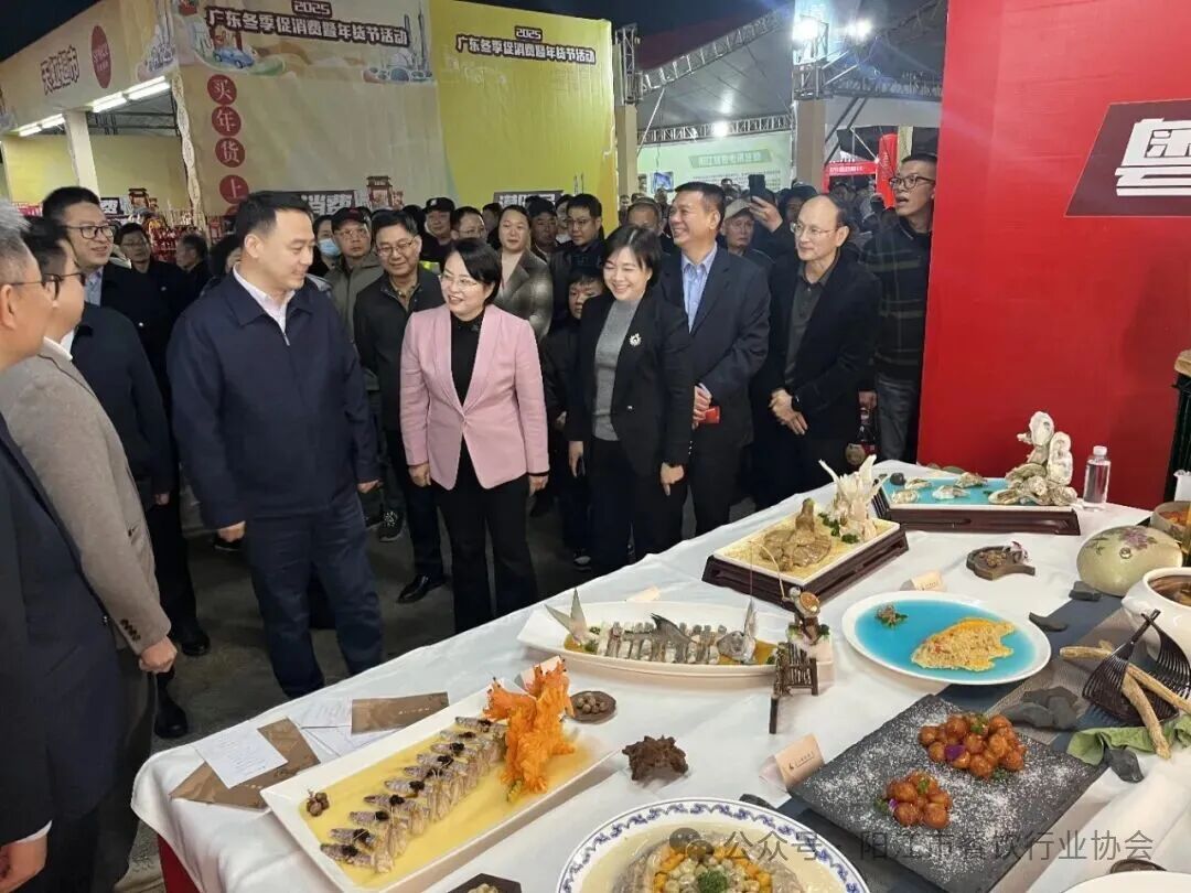 在年货节特色展区,长江国际酒店代表协会展示了阳江餐饮文化的重要成果——“漠江十二味”。该系列菜品由阳江市餐饮行业协会于2025年正式推出,汇聚阳江山海之珍,融汇地方饮食精髓,旨在系统呈现阳江独特的风味体系。展示现场,以海鲜等具有地域特色的阳江食材与人文元素为灵感设计的十二道菜品,吸引了众多市民驻足观赏、拍照咨询,成为年货节上一道亮丽的风景线。