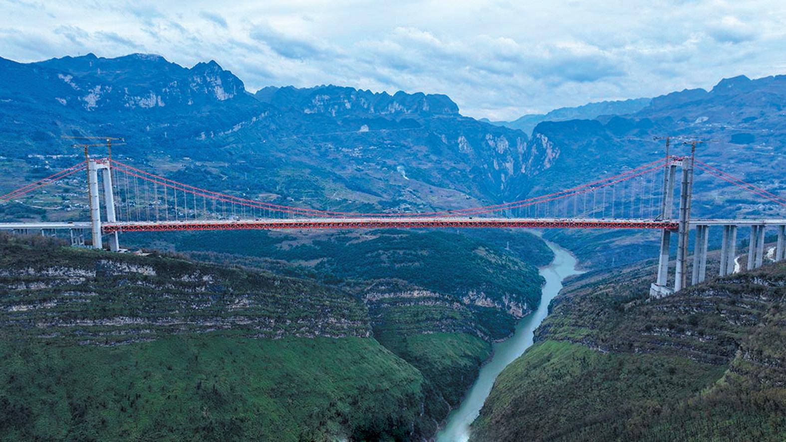 近日,安盘高速公路天门特大桥主体工程完工,目前正全力推进桥面附属设施安装工作。该大桥位于六盘水市境内,横跨北盘江大峡谷。大桥全长1553米,为主跨820米的钢桁梁悬索桥,桥面至江面高度为560米,相当于200层楼高,建成后将成为峡谷地区世界第三高桥、世界最高双向六车道钢桁梁悬索桥。(刘青摄)