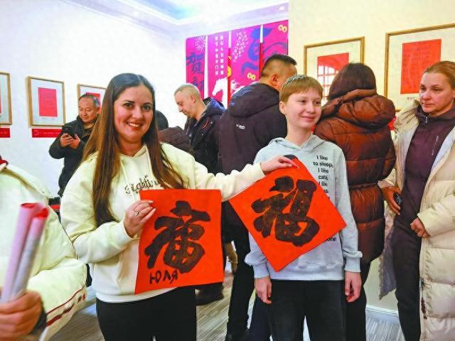 活动当天,场馆内张灯结彩,洋溢着浓浓的年味。中俄两国友人齐聚一堂,执笔绘“福”。在书法家的指导下,无论是熟练执笔的国内游客,还是初次尝试的俄方友人,都兴致勃勃地提笔挥毫,在红纸上书写对新春的美好祝愿。大家手持自己书写的“福”字作品,在精心布置的新年打卡点前合影留念,一个个形态各异的“福”字,不仅传递着富贵吉祥的传统寓意,更成为连接两国人民心灵的文化纽带。现场的俄罗斯友人表示,在具有历史意义的纪念馆里体验中国最传统的迎新年习俗,新奇而难忘,这让他们对绥芬河、对中国文化有了更深层次的理解。
