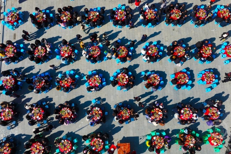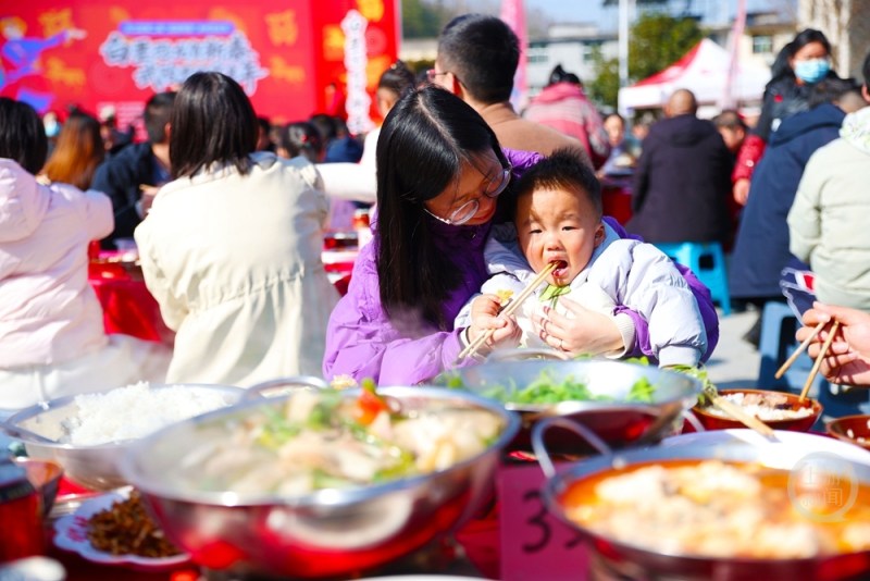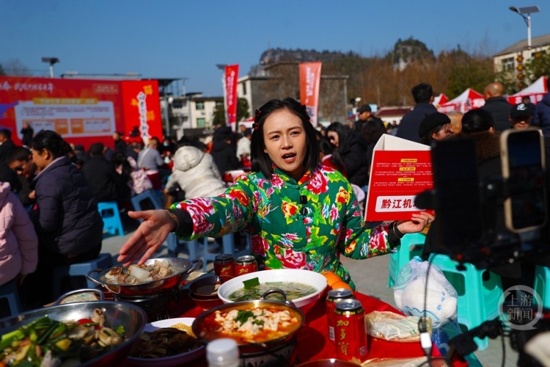 1月11日,重庆市黔江区,游客们在第二届武陵黑猪乡村文化节上体验土家刨汤宴。