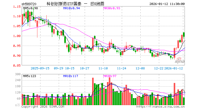1月12日,截止午间收盘,科创创新药ETF国泰(589720)跌0.90%,报0.995元,成交额6961.16万元。科创创新药ETF国泰(589720)重仓股方面,百济神州截止午盘跌0.65%,百利天恒涨0.22%,艾力斯跌1.91%,君实生物跌1.28%,泽璟制药跌4.14%,荣昌生物跌1.57%,博瑞医药跌1.56%,特宝生物跌4.44%,益方生物跌1.83%,迈威生物涨0.42%。