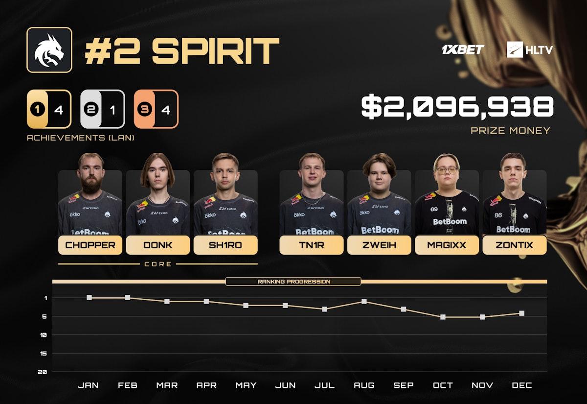 IEM卡托维兹站Spirit收获亚军,在总决赛中不敌实力更胜一筹的Vitality,而这次卡托维兹之旅也奠定了某种基调:在随后的三项赛事中,他们两度被Vitality淘汰出局。尽管Spirit仍是世界顶尖强队之一,在竞争相对较弱的PGL阿斯塔纳站夺冠并多次跻身四强,但面对Vitality乃至MOUZ这样的对手时,他们仍时有不及。