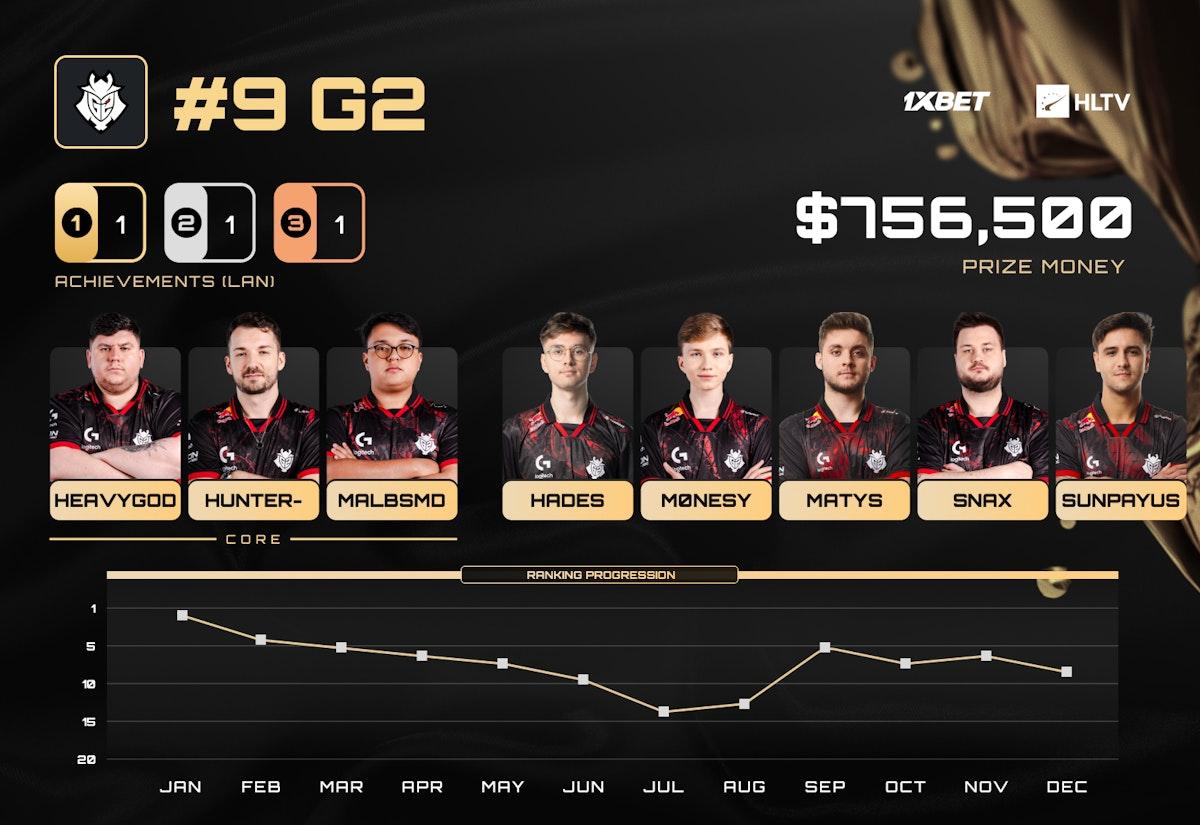 Ilya"m0NESY"Osipov在PGL布加勒斯特站后离队,令G2的处境雪上加霜。引入Olek"hades"Miskiewicz作为赛季末的过渡人选后,G2仍勉力打出尚可的表现并赢下部分系列赛,甚至险些跻身BLAST.tv奥斯汀Major的季后赛。但若延续此轨迹,他们很可能无缘本次榜单。
