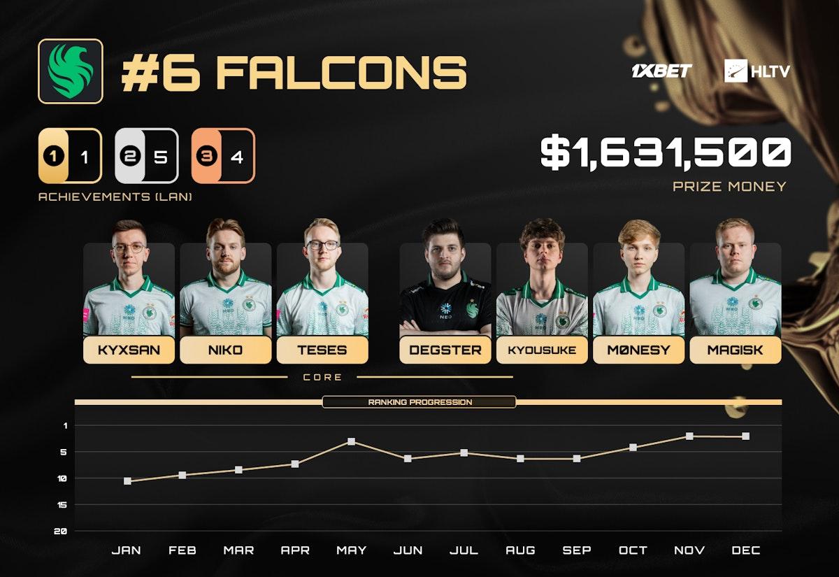 选手休赛期队伍再度补强,引入了Maxim"kyousuke"Lukin。虽然在IEM科隆站开局有些波折,但此后Falcons稳居世界前五战队之列,连续五项赛事至少跻身四强。战队还成功闯入StarLadder布达佩斯Major季后赛——这无疑是他们迄今在Major周期中的最佳表现,为这个取得巨大正向进步的年头画上圆满句号。从PGL布加勒斯特站起,Falcons在参与的12项赛事中九次跻身四强,距离闯入本次榜单前五仅一步之遥。