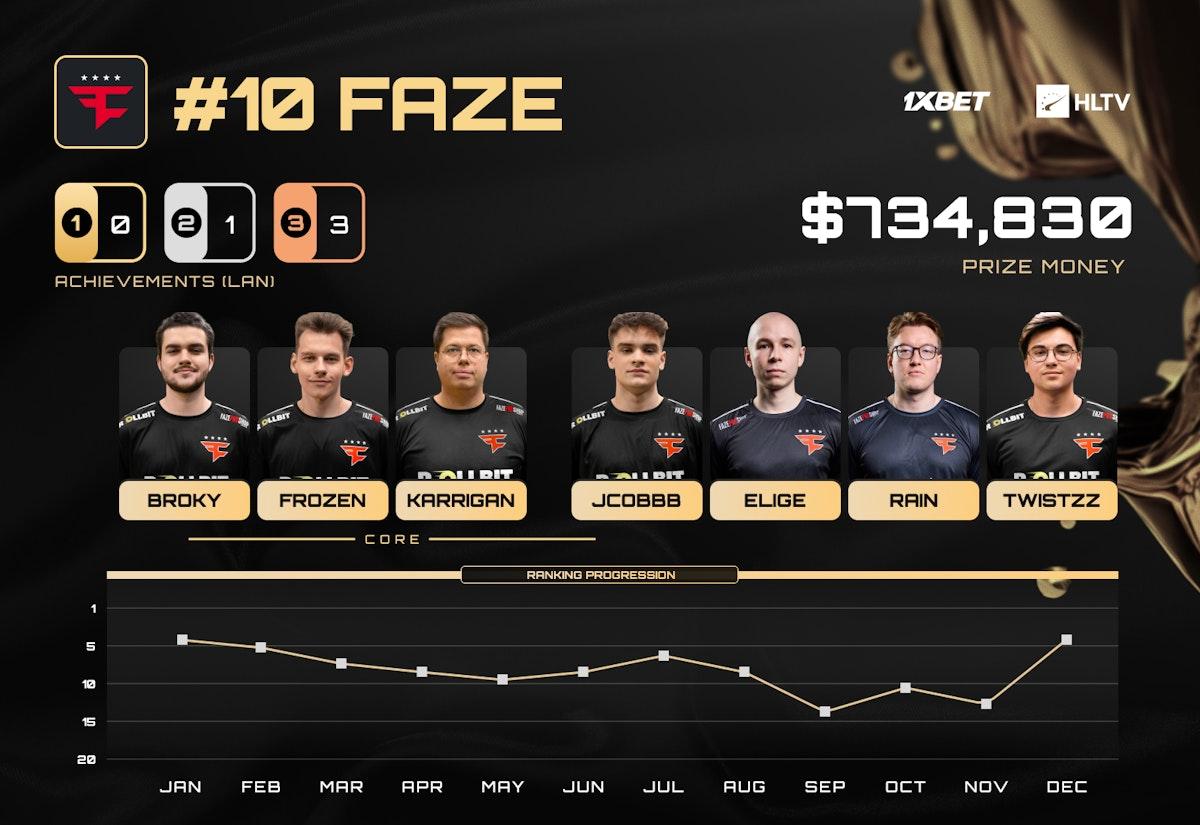 正是这次Major征程将FaZe锁定在年度十佳战队之列。若非因BLAST.tv奥斯汀Major参赛阵容缺少broky、Finn"karrigan"Andersen与David"frozen"Čerňanský三位核心成员导致该战绩不计入排名,他们本可位列第九名。