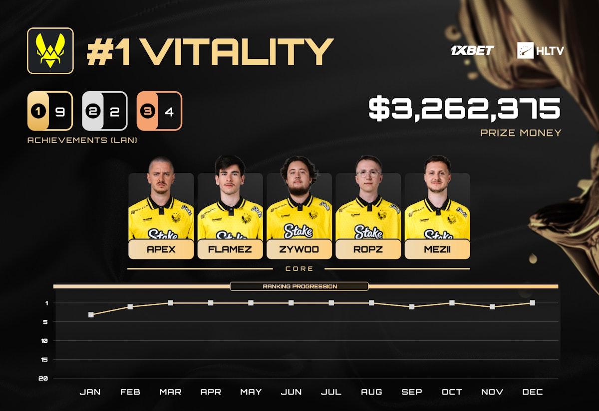 年度最佳战队花落谁家从未存在悬念。Vitality仅在年初的首项赛事BLASTBounty第一赛季中稍作热身(取得5-8名),一旦进入状态,他们便展现出势不可挡的统治力。