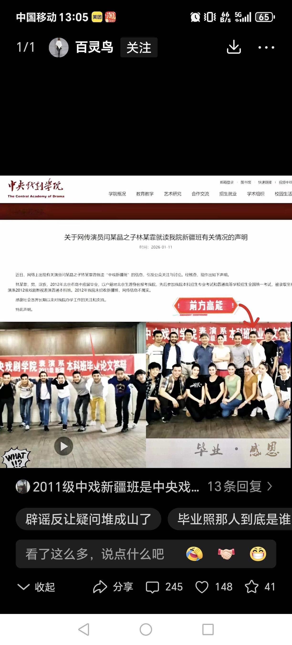 理不辩不明,这手移花接木玩得真是漂亮,不愧是演戏的!请中戏解释一下,图片里参加毕业答辩的究竟是谁?当然,博主举报闫学晶儿子是2012级中戏学生,中戏的回复也没错,2012年确实没有招收过闫学晶儿子! 中戏新疆班(属内地高校支援新疆培养少数民族人才协作计划)的民考考生,一般需先念一年预科,考核达标后,第二年转入大一,总学制五年(预科1年 + 本科4年)。中戏2010年招生提示清晰写明:新疆班学生录取后,按教育部安排在预科班学习一年,期满合格便转入相关专业。例如2011级新疆班学生依克桑,先在中央民族大学预科教育学院学习一年,2012年9月正式进入中戏本科班就读。