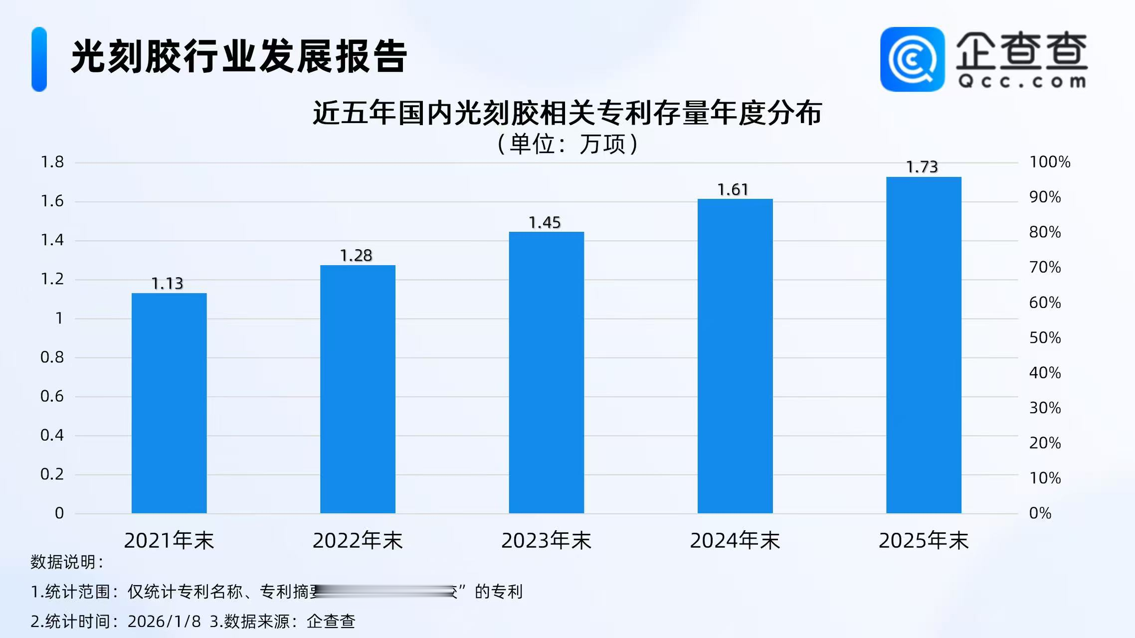 企查查数据显示,截至1月12日,国内光刻胶相关现存企业达1040家,截至目前,国内光刻胶相关专利达1.73万项。