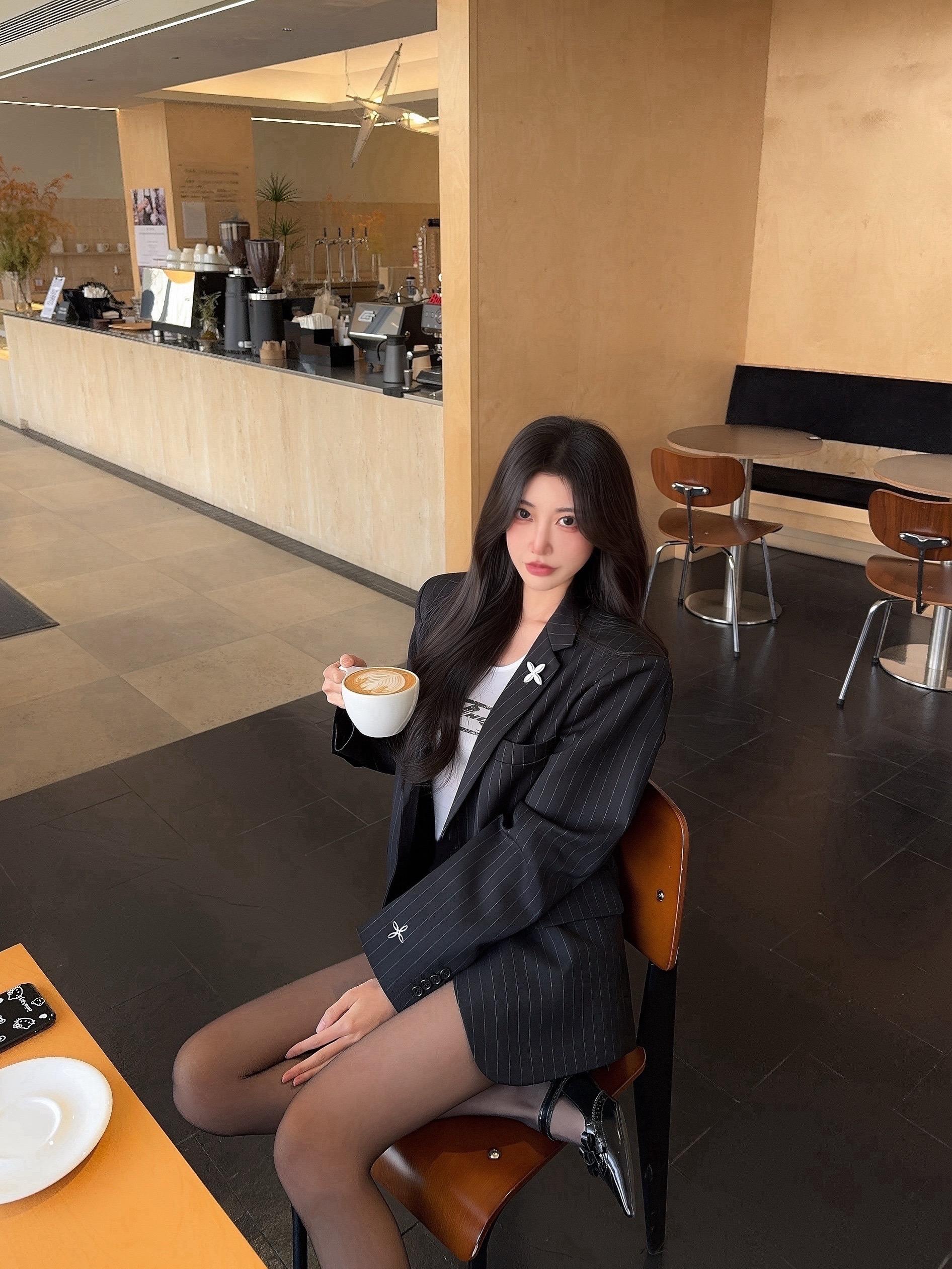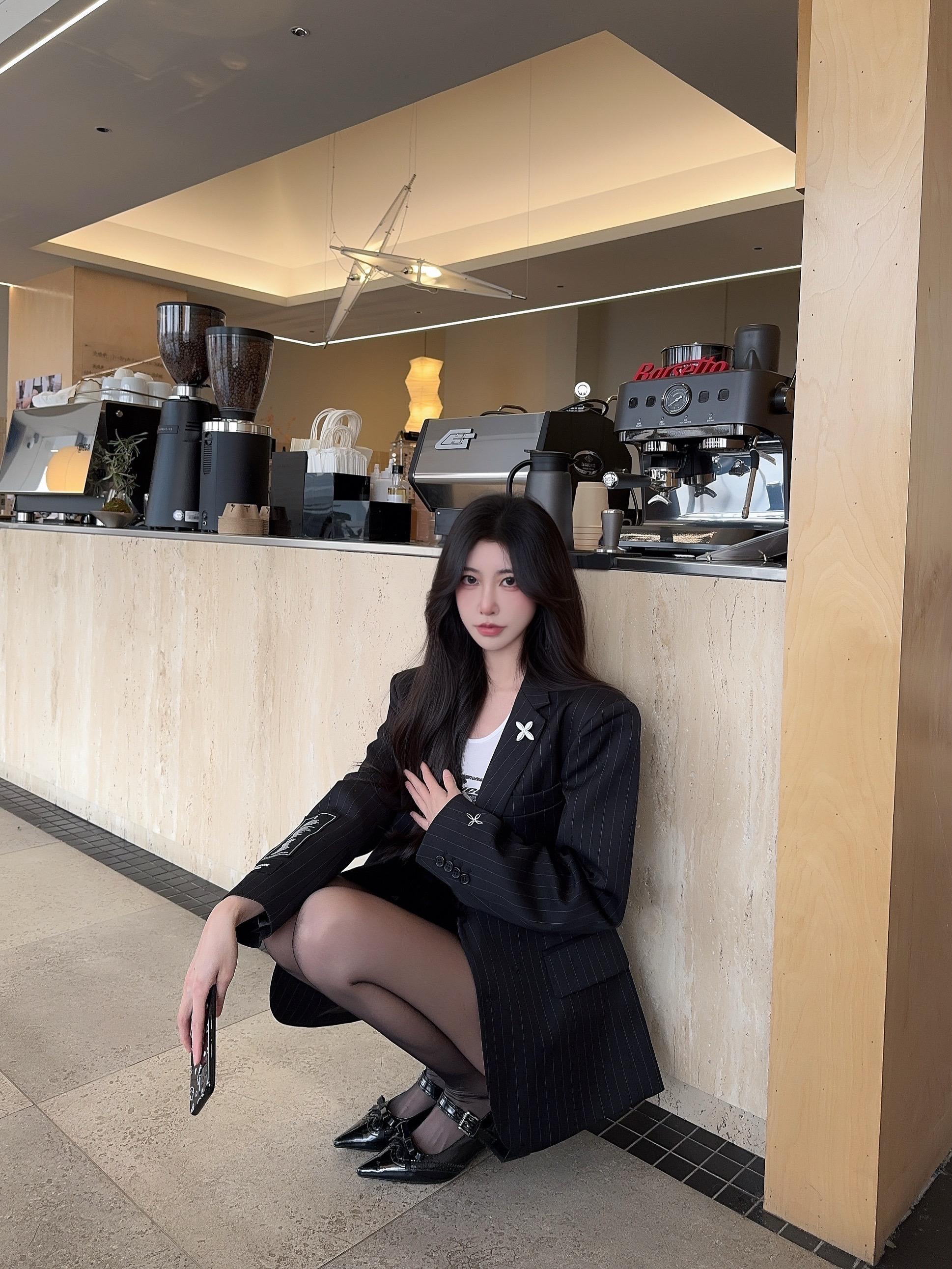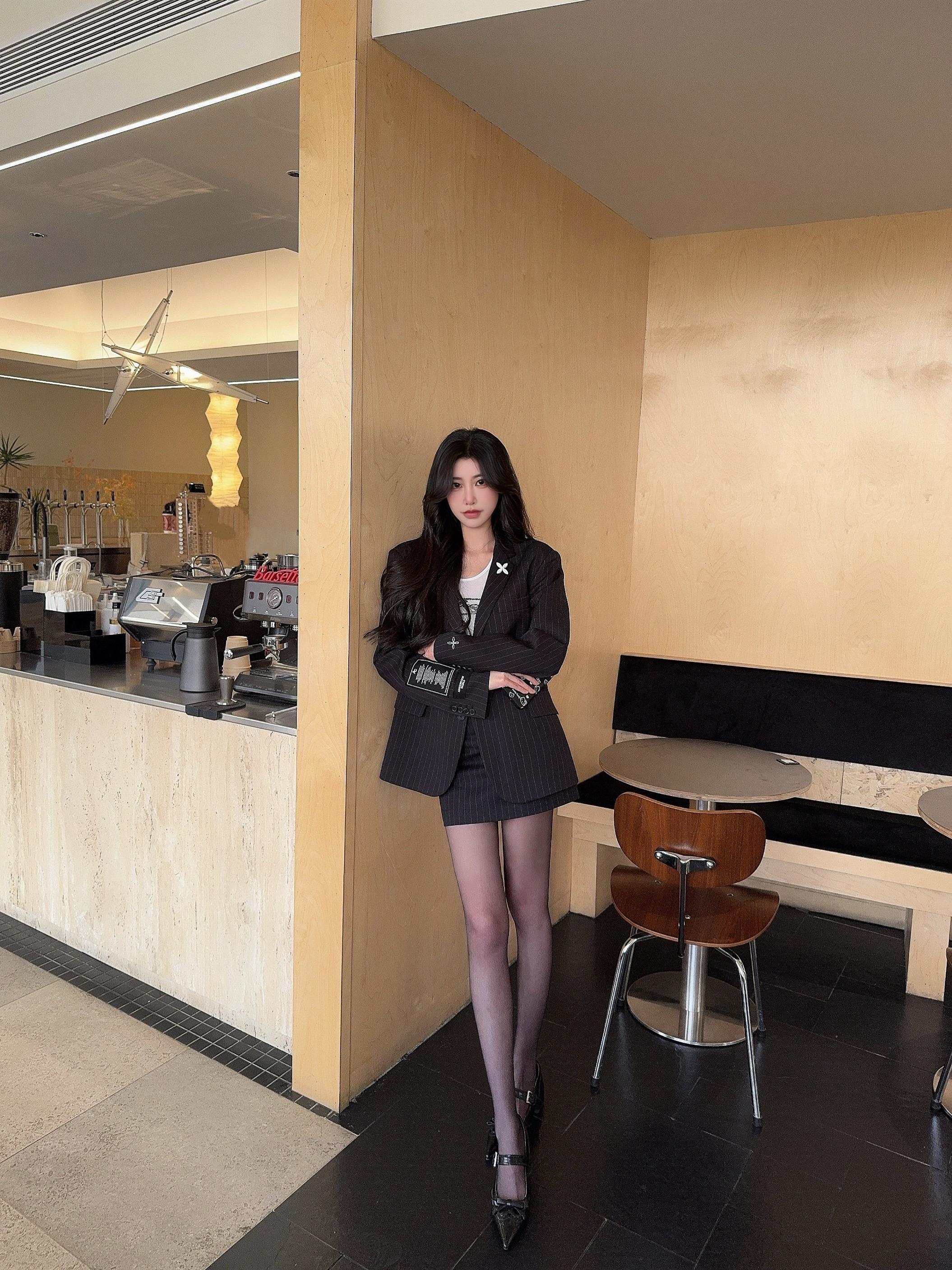 咖色西装套装配同色系针织内搭,霓虹背景揉出干练又妩媚的轻熟氛围感☕灰色西装套装