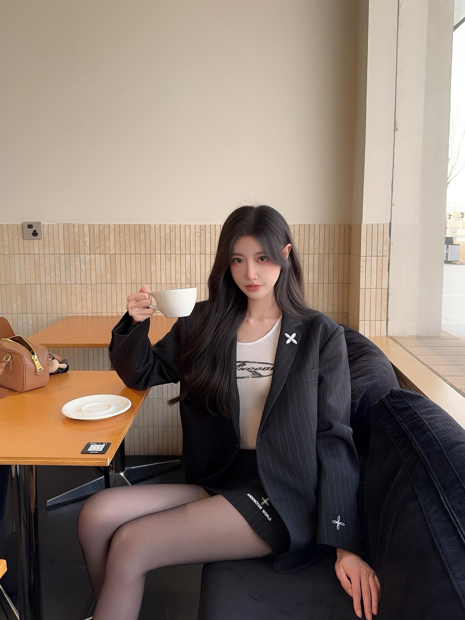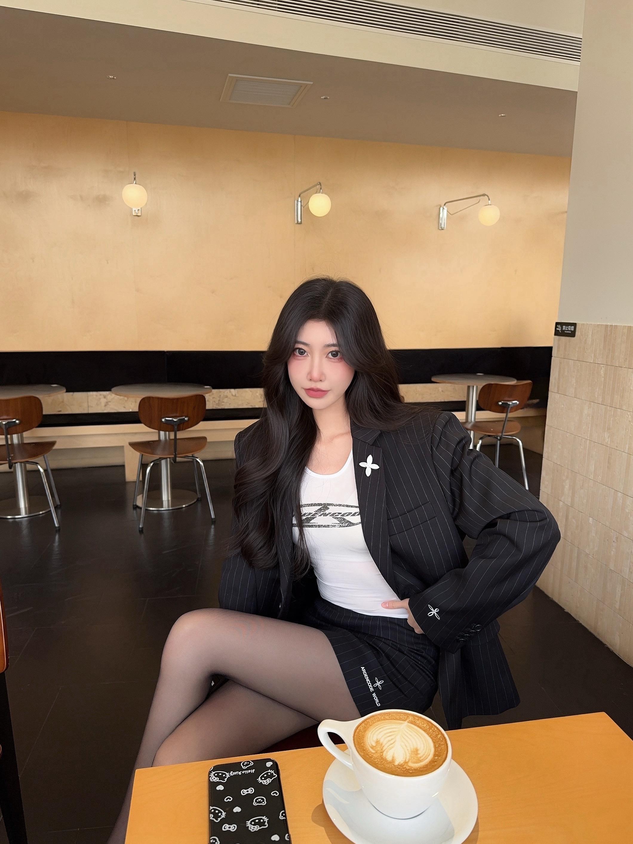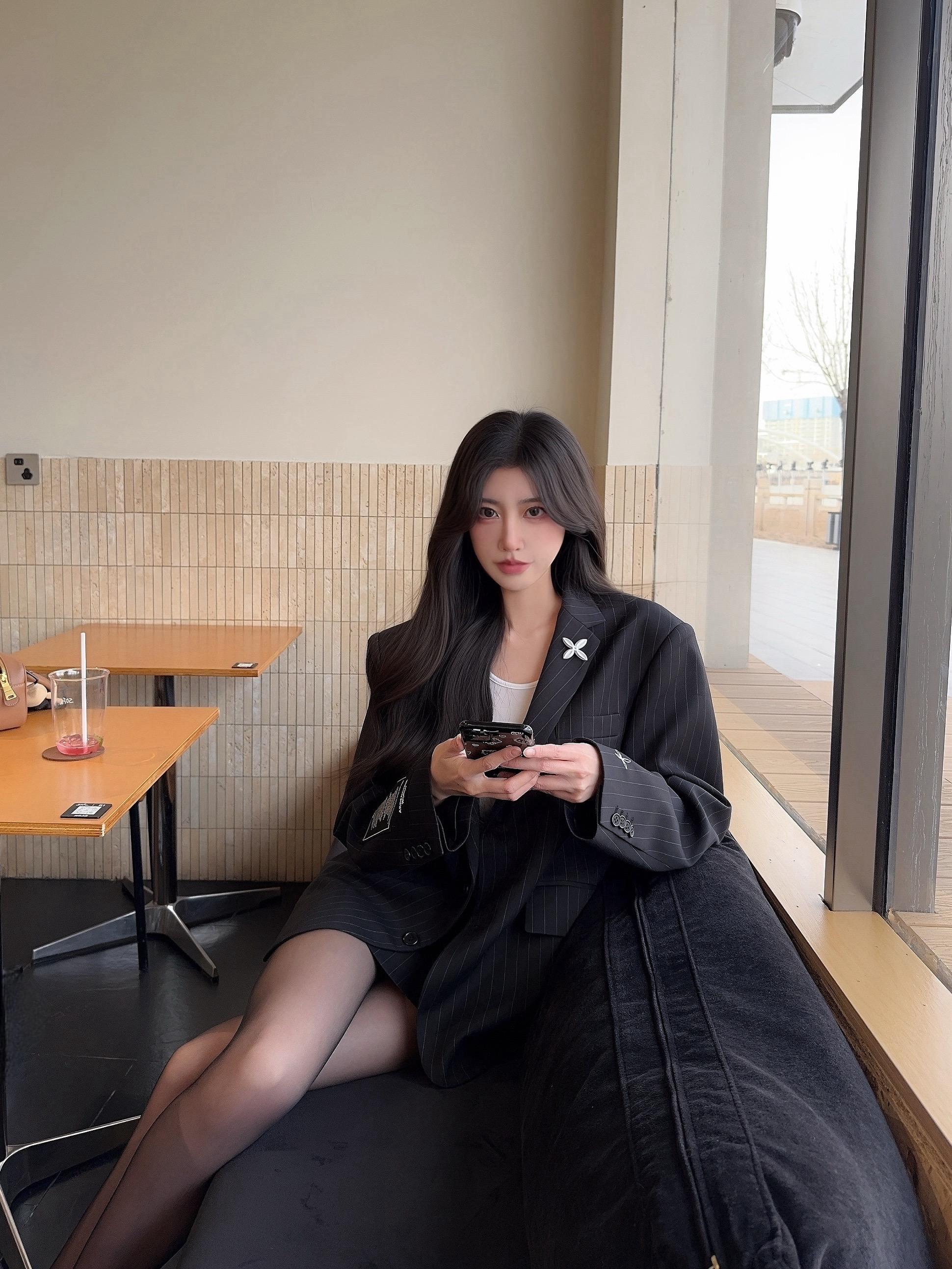 咖色西装套装配同色系针织内搭,霓虹背景揉出干练又妩媚的轻熟氛围感☕灰色西装套装