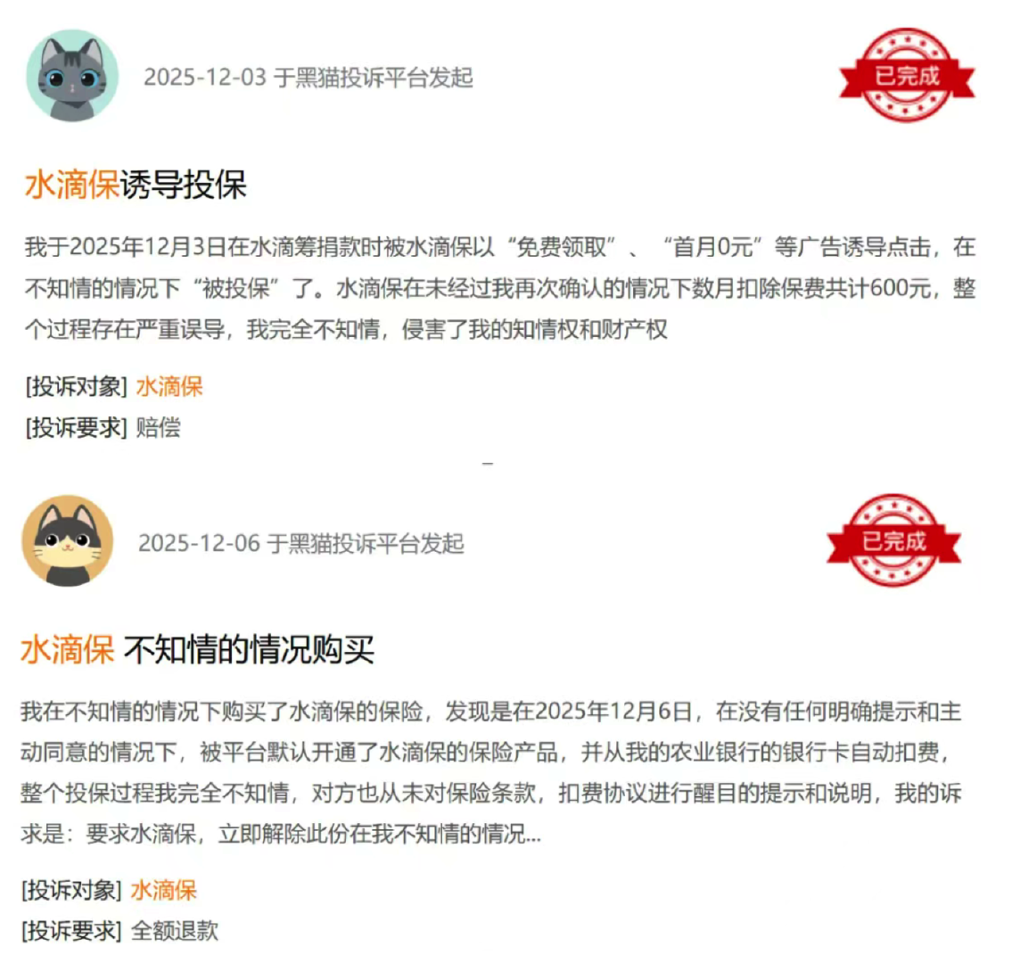 在黑猫投诉平台上,数千条关于水滴保的投诉中,大量案例指向了相似的路径:用户可能只是在水滴筹平台进行了一次爱心捐赠,随后便被引导至保险页面;又或是误触了小程序中的弹窗,在没有经过严格身份验证和意愿确认的情况下,开通了微信、支付宝或京东的免密支付。
