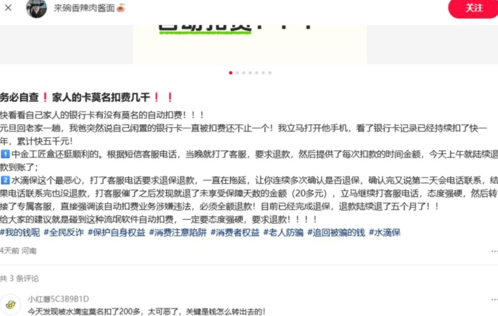 近期,大量消费者在社交平台与投诉机构反映,自己或家中老人的账户在不知情的情况下,遭遇了名为“水滴保”的持续扣费。这种扣费往往具有极强的隐蔽性,许多当事人直到银行卡余额骤减,或者收到莫名其妙的数百元扣款短信时,才惊觉自己不知何时成了一名“投保人”。