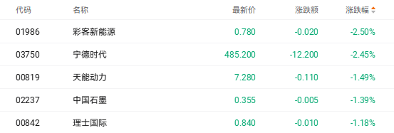 锂电池股则受政策调整影响承压,截至收盘,宁德时代(03750.HK)跌2.45%、天能动力(00819.HK)跌1.49%、中国石墨(02237.HK)跌1.39%。