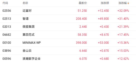 受此带动,AI产业链个股全线上扬。以AI应用为例,智谱(02513.HK)涨31.40%、微盟集团(02013.HK)涨21.39%、MINIMAX-WP(00100.HK)涨15.36%。
