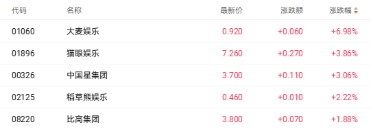 截至收盘,大麦娱乐(01060.HK)涨6.98%、猫眼娱乐(01896.HK)涨3.86%、稻草熊娱乐(02125.HK)涨2.22%。
