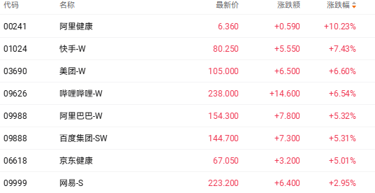 科网巨头今日表现亮眼,截至收盘,阿里健康(00241.HK)涨10.23%、快手-W(01024.HK)涨7.43%、美团-W(03690.HK)涨6.60%。