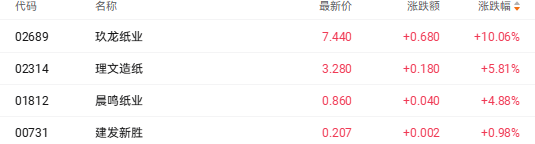 截至收盘,玖龙纸业(02689.HK)涨10.06%、理文造纸(02314.HK)涨5.81%、晨鸣纸业(01812.HK)涨4.88%。