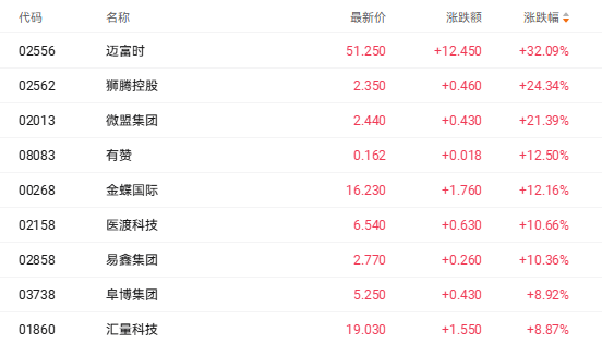以SaaS概念为例,迈富时(02556.HK)涨32.09%、有赞(08083.HK)涨12.50%、金蝶国际(00268.HK)涨12.16%。
