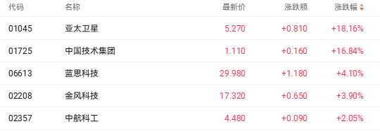 截至收盘,亚太卫星(01045.HK)涨18.16%、蓝思科技(06613.HK)涨4.10%、金风科技(02208.HK)涨3.90%。