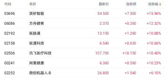 以AI医疗为例,英矽智能(03696.HK)涨15.96%、医脉通(02192.HK)涨10.88%、医渡科技(02158.HK)涨10.66%。