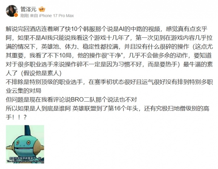 直播吧1月12日讯近期英雄联盟韩服一名玩家以92%的胜率登顶韩服前十引发关注,对此解说管泽元更博评价:我看这个游戏十几年了,第一次见到在游戏内容几乎拉满的情况下,英雄池、体力、稳定性都拉满,并且没有什么很碎的操作(这点尤其重要,我看了不下10局,他的操作很“干净”,几乎不会做多余的动作,要知道对于很多职业选手来说操作碎不一定是因为习惯不好,而是要热手)最牛逼的素人了(假设他是素人)。