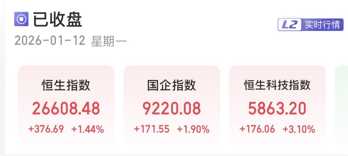 上证报中国证券网讯(刘禹希记者严晓菲)1月12日,港股三大指数收涨。截至收盘,恒生指数涨1.44%,报26608.48点;恒生国企指数涨1.9%,报9220.08点;恒生科技指数涨3.1%,报5863.2点。