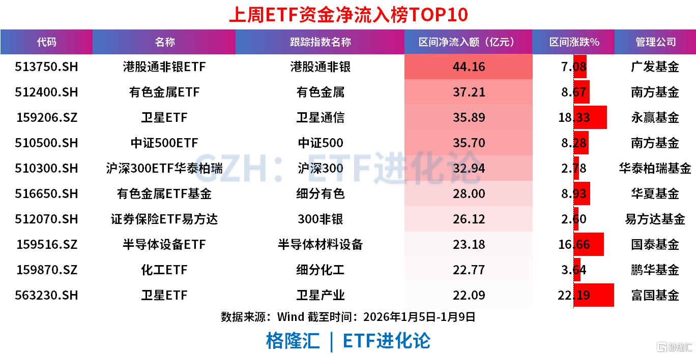 港股通非银ETF、有色金属ETF、卫星ETF、中证500ETF、沪深300ETF华泰柏瑞上周分别净流入44.16亿元、37.21亿元、35.89亿元、35.70亿元、32.94亿元。