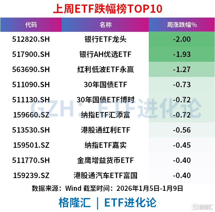 跌幅方面,银行ETF龙头、银行AH优选ETF、红利低波ETF永赢、30年国债ETF、30年国债ETF博时、纳指ETF汇添富分别跌-2.00%、-1.93%、-1.27%、-0.73%、-0.72%、-0.72%。