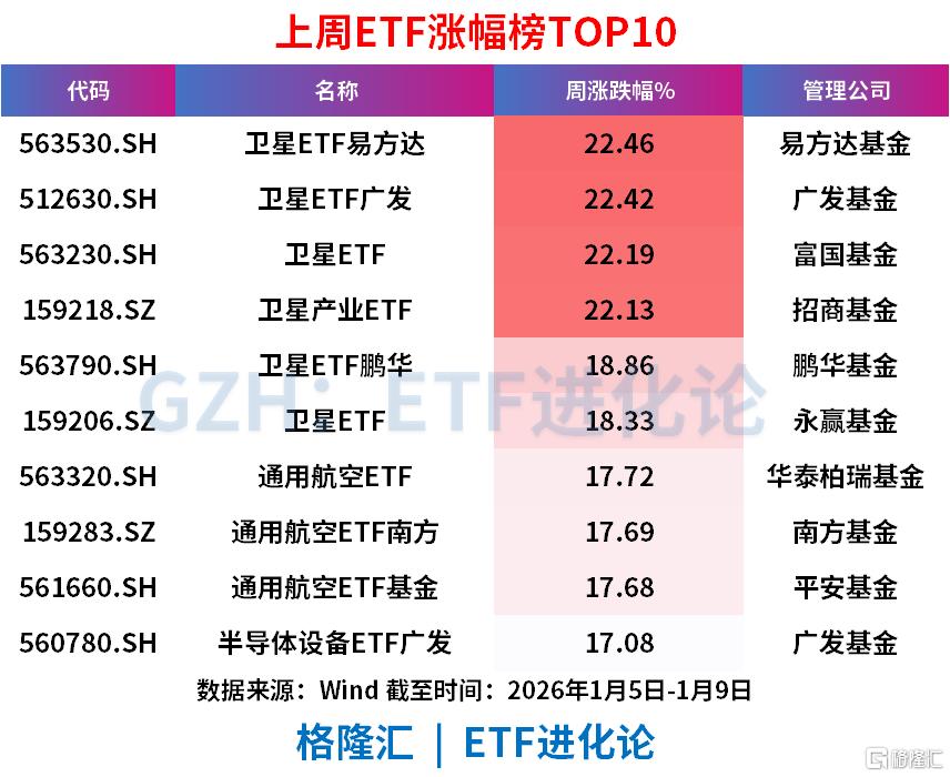 涨幅方面,卫星ETF易方达、卫星ETF广发、卫星ETF、卫星产业ETF、卫星ETF鹏华、卫星ETF上周分别涨22.46%、22.42%、22.19%、22.13%、18.86%、18.33%。