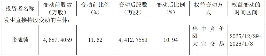 公告显示,科林电气近日收到公司持股5%以上股东张成锁发来的告知函,他于2025年12月29日至2026年1月8日期间,通过二级市场集中竞价交易方式减持公司股份274.65万股,通过二级市场大宗交易减持公司股份0股,合计占公司总股本的0.68%。