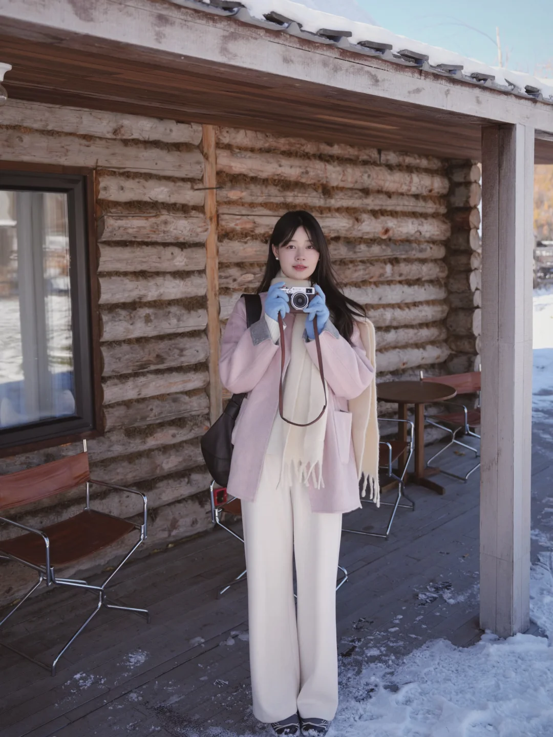 在喀纳斯的雪后台阶打滑。