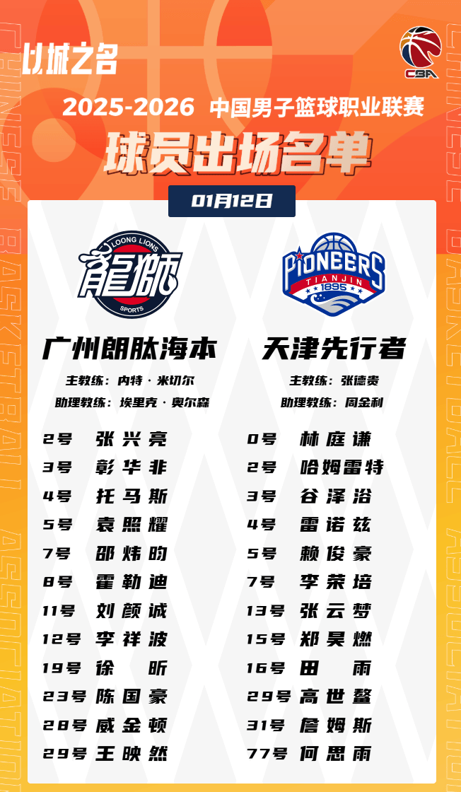 虎扑01月12日讯今晚CBA常规赛,天津对阵广州的大名单已经公布。