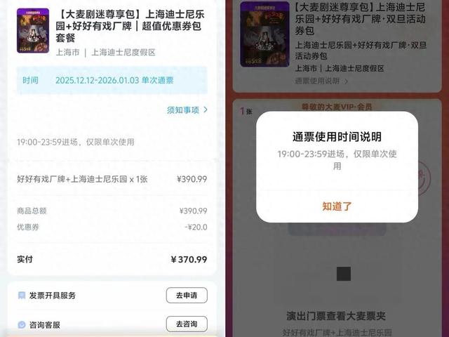 去年12月30日晚间,市民江先生在看到大麦App推送的“上海迪士尼乐园+好好有戏厂牌”的活动广告。想到可以借此庆祝跨年,又是较为优惠的价格,他在没有仔细阅读购买详情情况下,果断支付了742元,购买了2份套餐。当时支付界面大字粗体强调“迪士尼乐园”以及“2025.12.12-2026.01.03单次通票”字样,显示了他们带有个人身份证信息的票夹,令他误以为已成功购买了乐园门票。