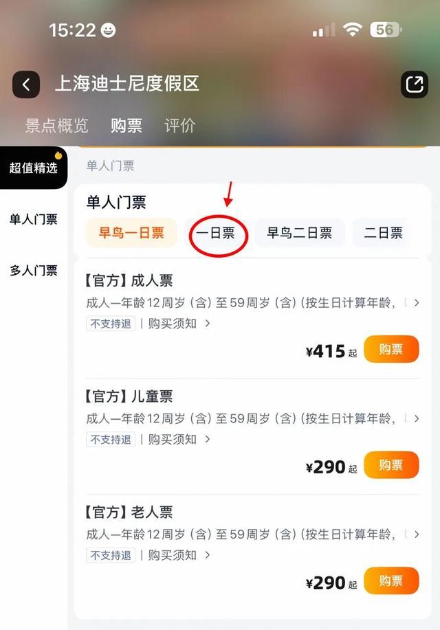 在大麦平台“上海迪士尼乐园”的购票专区,默认界面为成人票、儿童票和老人票的“早鸟一日票”。