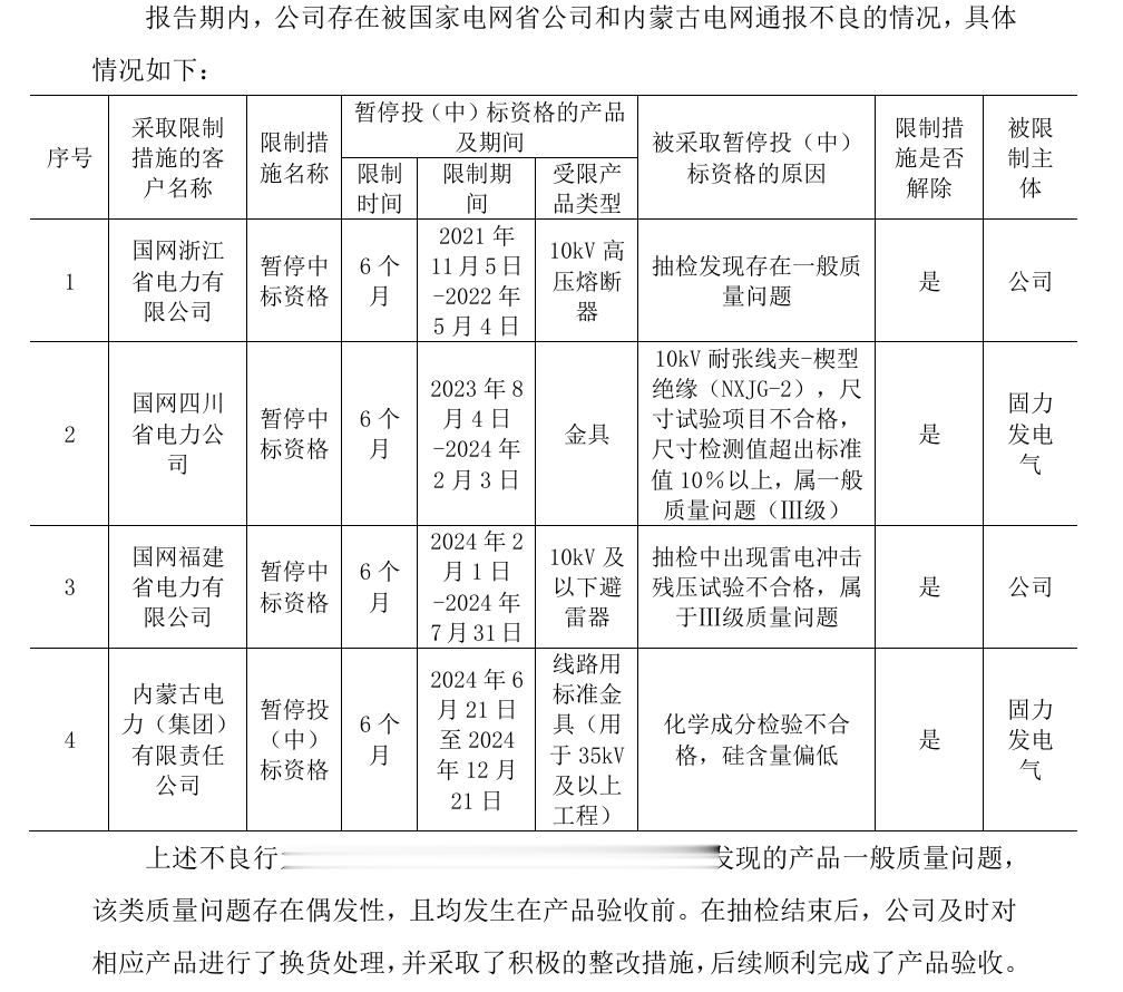 然而,研读12月31日披露的《审核问询函回复》第184页及相关附件可以发现,报告期内固力发在浙江、四川、福建、内蒙古等多个核心省级辖区内,多次因产品质量问题收到电网公司的违规通报,呈现出质量管控层面的连续挑战。