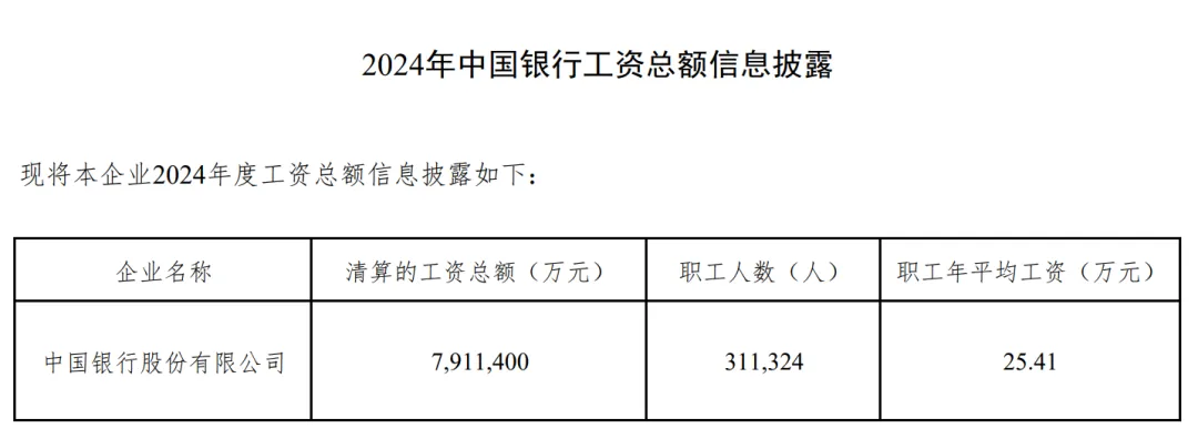 具体来看,2024年度,中行清算的工资总额791.14亿元,职工年平均工资25.41万元,同比增长2.3%。