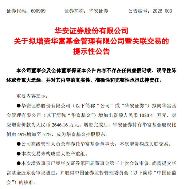 1月12日晚,华安证券发布公告,拟向华富基金增加出资额1020.41万元,对应增资价款为2646.16万元。增资完成后,其持有华富基金股权比例将由49%增至51%,成为华富基金控股股东。
