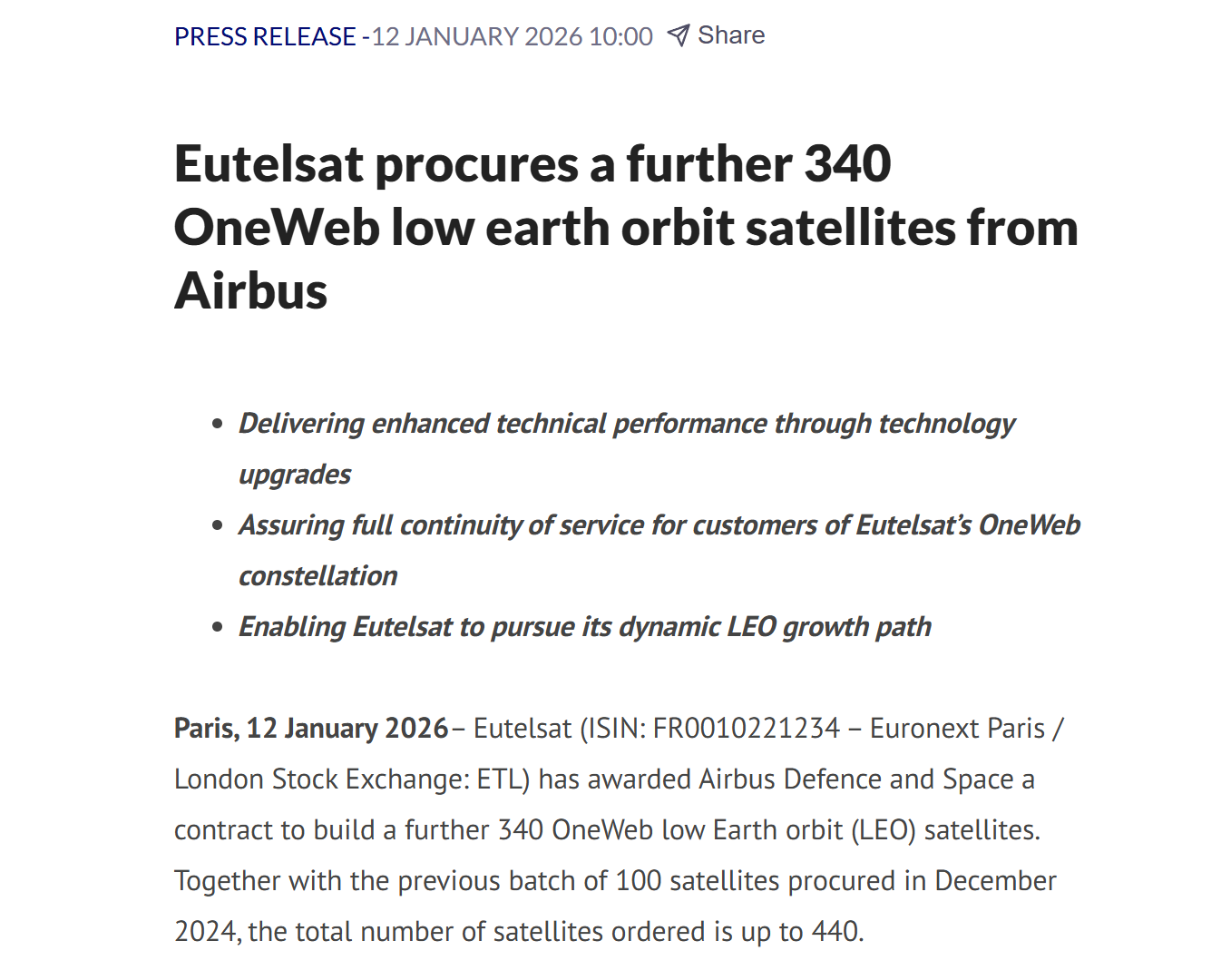 公告称,Eutelsat已经与空中客车国防航天公司签订合同,委托其再制造340颗OneWeb低地球轨道(LEO)卫星,加上2024年采购的首批100颗卫星,订单总量将增加到最多440颗。