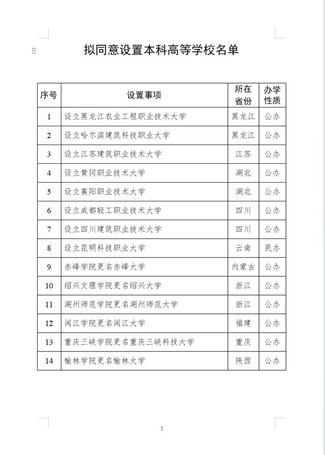 公示称,根据《中华人民共和国高等教育法》《普通高等学校设置暂行条例》《普通本科学校设置暂行规定》《本科层次职业学校设置标准(试行)》等有关规定,经教育部党组会议审议,拟同意设置黑龙江农业工程职业技术大学等14所学校,现予公示。公示时间为2026年1月12日至1月16日。