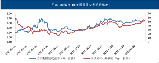 临近9月底,央行重启14天逆回购操作,叠加前期收益率已上行至相对合理的水平,债市做空情绪有所回落,收益率有所下行。10月后美国在关税问题上的态度反复,流动性保持合理充裕,收益率整体呈区间波动走势,临近月底央行表示将恢复国债买卖操作,债市做多情绪升温,收益率波动下行。11月央行公告买债规模不及预期,叠加市场对基金销售新规的落地担忧,尽管经济金融数据偏弱,收益率仍呈小幅上行走势。进入12月,重要会议先后落地但政策增量有限,市场预期不断反复,权益市场带来情绪层面扰动,但在央行呵护流动性之下债市宽幅震荡,曲线进一步陡峭化。