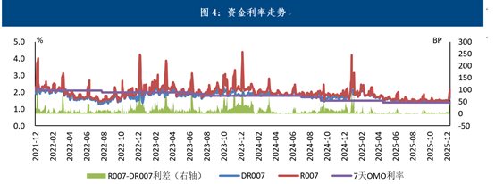 资金利率中枢2025年呈现波动下行走势,DR007与R007利差持续低位。具体来看,1-12月DR007中枢为1.63%,R007中枢为1.71%。其中,一季度在央行持续强调防空转下,资金面相对紧张,DR007中枢为1.94%,较去年四季度上行25.59BP;R007中枢为2.11%,较去年四季度上行23.3BP,部分时点DR007与R007利差甚至出现倒挂现象,显示出资金面尤其是银行体系资金面较为紧张。