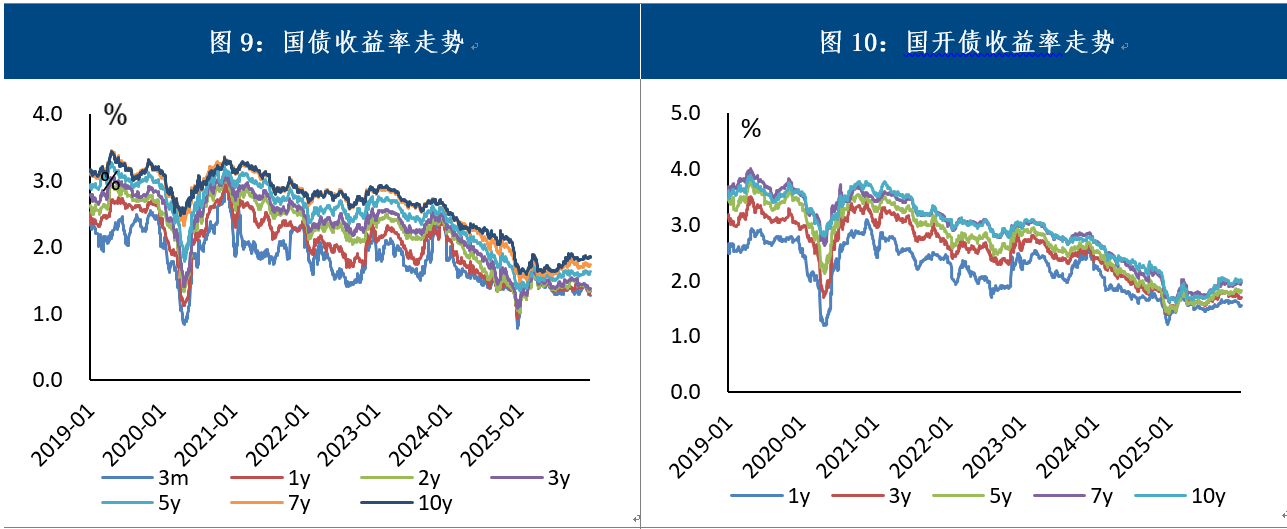 第四轮:7月3日到12月31日,收益率区间[1.6406%,1.9022%],波动范围26.16BP。7月以来在反内卷政策持续推进等因素影响下,市场信心有所回暖、股债跷跷板效应持续,叠加基金费率新规引发市场担忧、基金赎回负反馈效应加剧,收益率呈现波动上行走势,9月10年期国债收益率一度突破1.9%,高于政策利率的幅度处于去年12月以来高位。