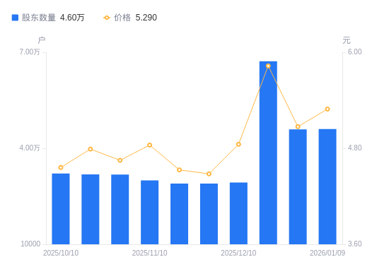 日期A股户数(户)流通A股户均持股数(股)户均持股市值(万元)2026-01-09460279114.024.822025-12-31459099137.454.632025-12-19672156241.033.642025-12-102930014317.106.942025-11-282897414478.196.492025-11-202897014480.196.562025-11-102997313995.636.772025-10-313176213207.326.142025-10-203182913179.526.312025-10-103213513054.025.95
