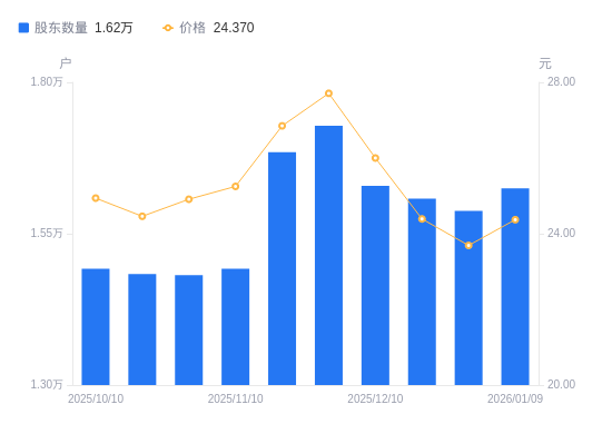 日期A股户数(户)流通A股户均持股数(股)户均持股市值(万元)2026-01-09162474767.9211.622025-12-31158754879.6511.562025-12-19160774818.3411.752025-12-10162904755.3312.362025-11-28172824482.3712.422025-11-20168474598.1112.352025-11-10149195192.3313.112025-10-31148175228.0813.022025-10-20148355221.7312.772025-10-10149205191.9812.95
