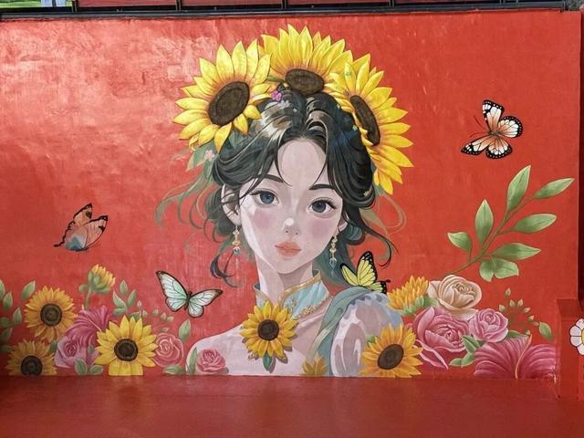 创作者以细腻笔触勾勒出少女的轻盈身姿,环绕在身边的向日葵热烈盛放,蝴蝶薄如蝉翼的翅脉纹理清晰可辨,浮雕的凹凸肌理与彩绘的明暗层次相互映衬……使少女仿佛从墙面中跃然而出,蝴蝶振翅欲飞,营造出虚实交织的艺术氛围。现场还有气膜感应开花向日葵和地面涂鸦,创意满满。