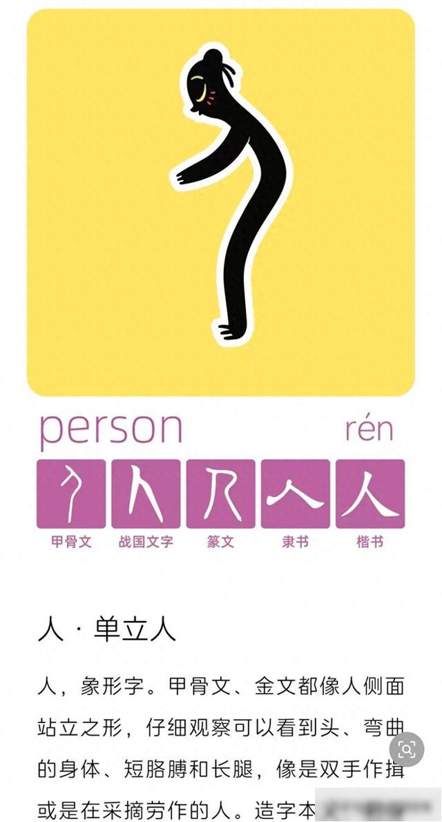 人,象形字。甲骨文、金文都像人侧面站立之形,仔细观察可以看到头、弯曲的身体、短胳膊和长腿,像是双手作揖或是在采摘劳作的人。造字本义:躬身垂臂的劳动者。