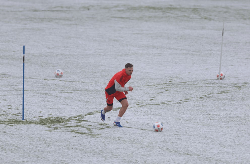 周一上午,在球队8-1大胜沃尔夫斯堡后获得一天假期之际,因脚踝伤势已缺席三周的基米希在康复教练本杰明·索默的陪同下,独自于雪中进行专项训练。面对严寒,身着厚重冬装的索默与只穿短裤的基米希形成鲜明对比,后者甚至在训练前多次用雪擦拭小腿,以帮助肌肉适应低温环境。