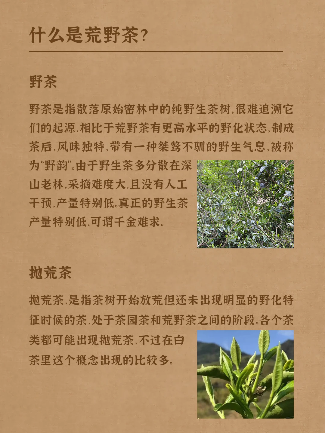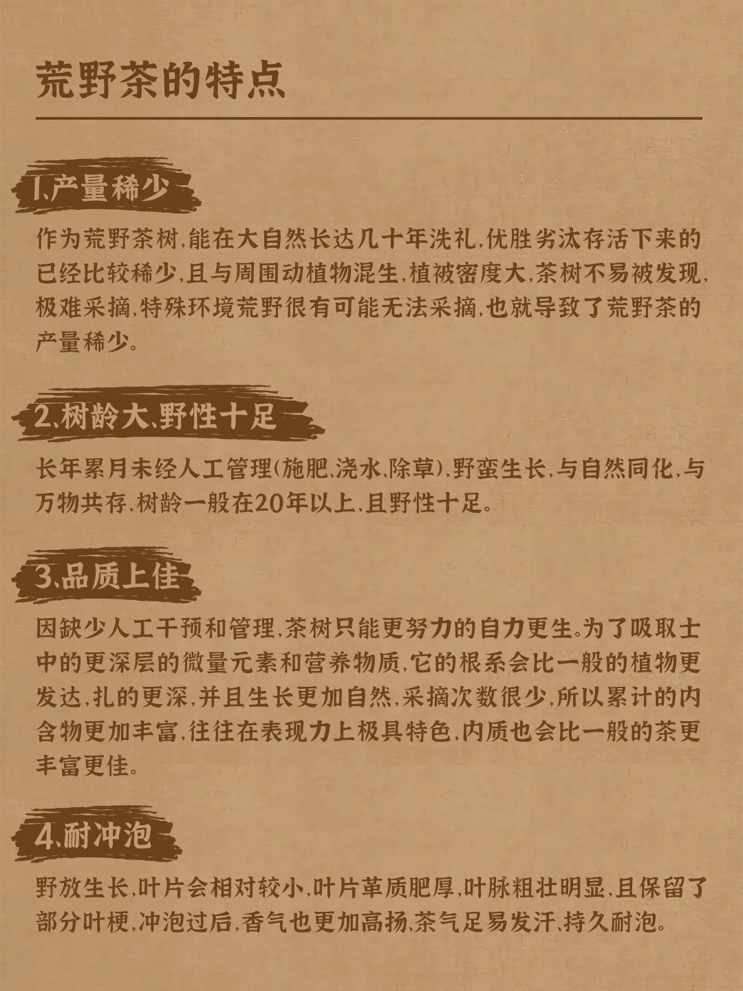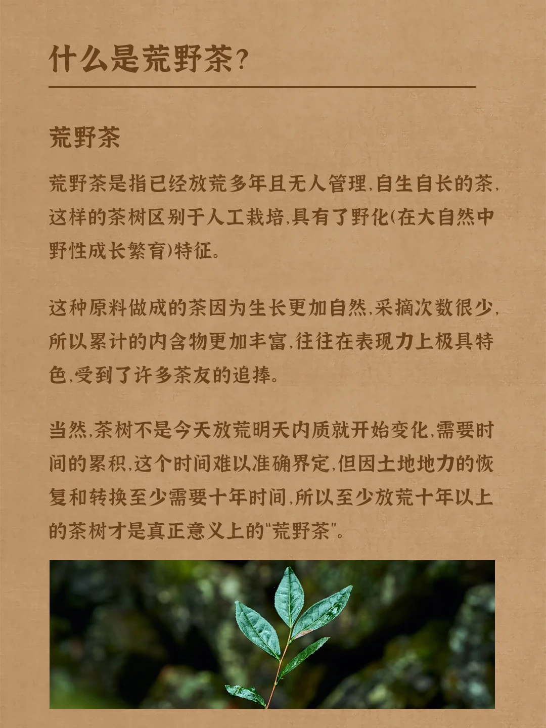 荒野茶,指自然生长于深山、荒野或遗弃茶园的茶树,无人为干预(不施肥/不打药/不修剪),靠自然竞争存活,自带“野生感”的茶中珍品!