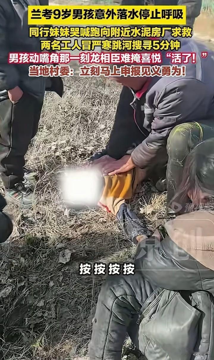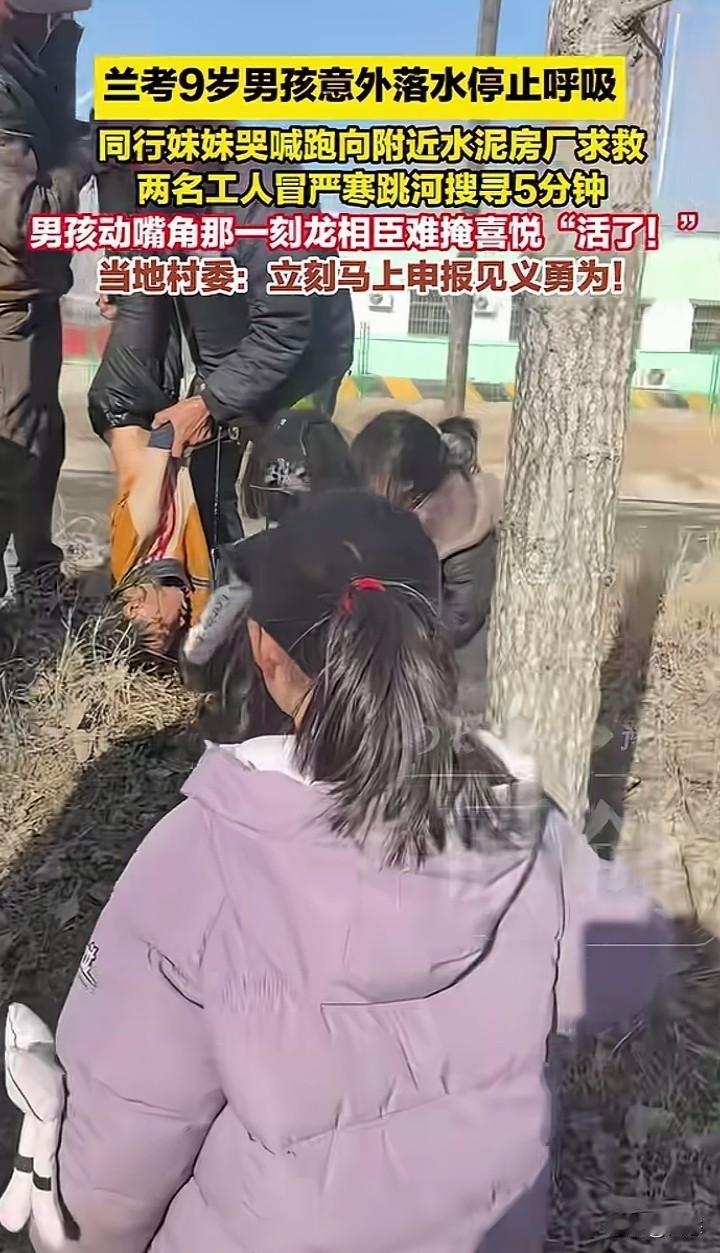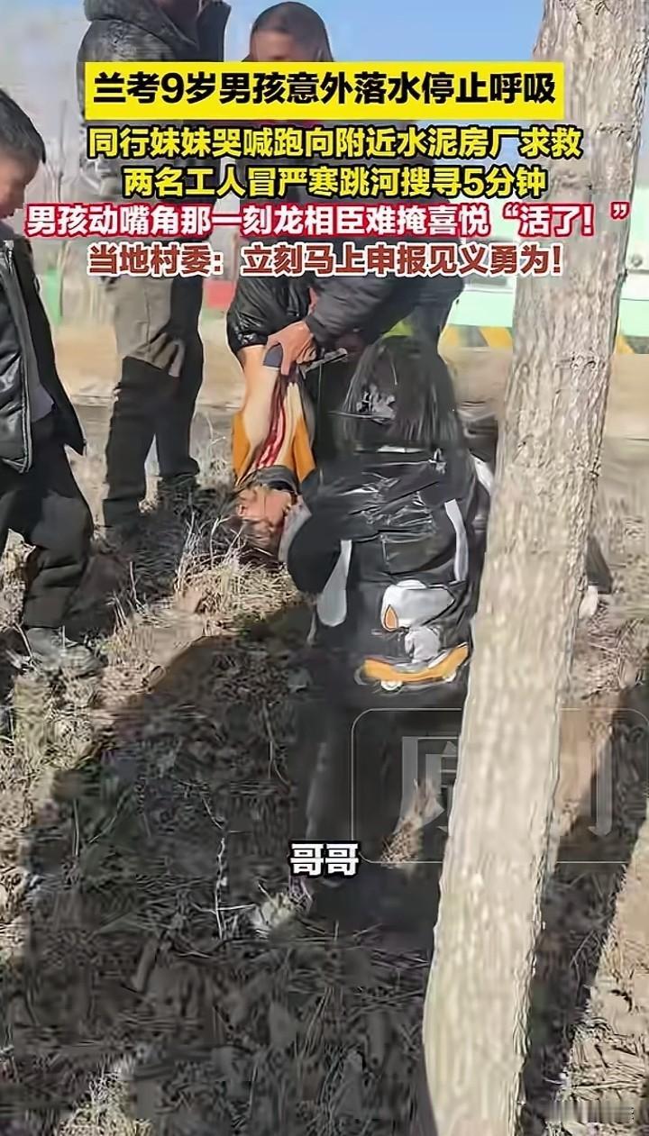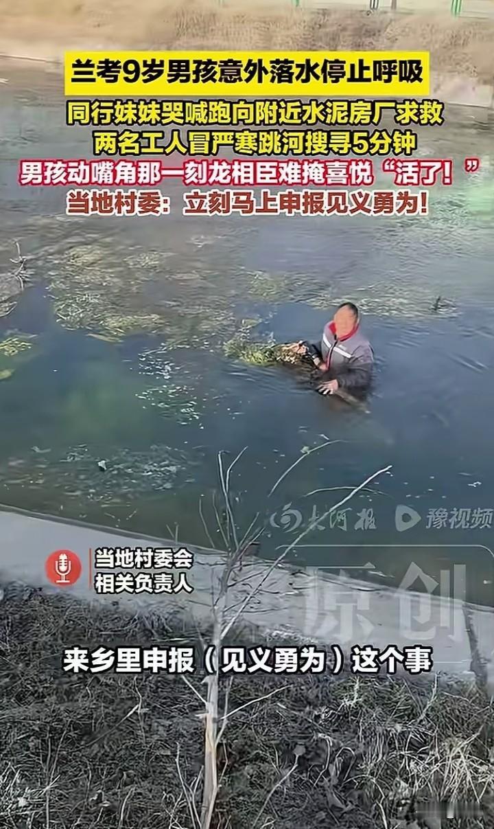 河南兰考一9岁男孩意外落入水中,同行的妹妹看到哥哥落入水中非常着急,哭着跑向附近的水泥厂房求救。两名工人听到呼救后,马上赶到事发地救人,他们 冒着寒冷刺骨的河里搜寻了5分钟,小男孩被救上岸,旁边妹妹一直叫哥哥,妹妹害怕失去哥哥,不停的呼喊。不幸中 的万幸,小男孩被救活了,如果在晚一些,后果不堪设想啊!还好妹妹没有失去理智,长大后希望哥哥好好带妹妹。 救人的两位工人也被评为见义勇为,为他们点赞。